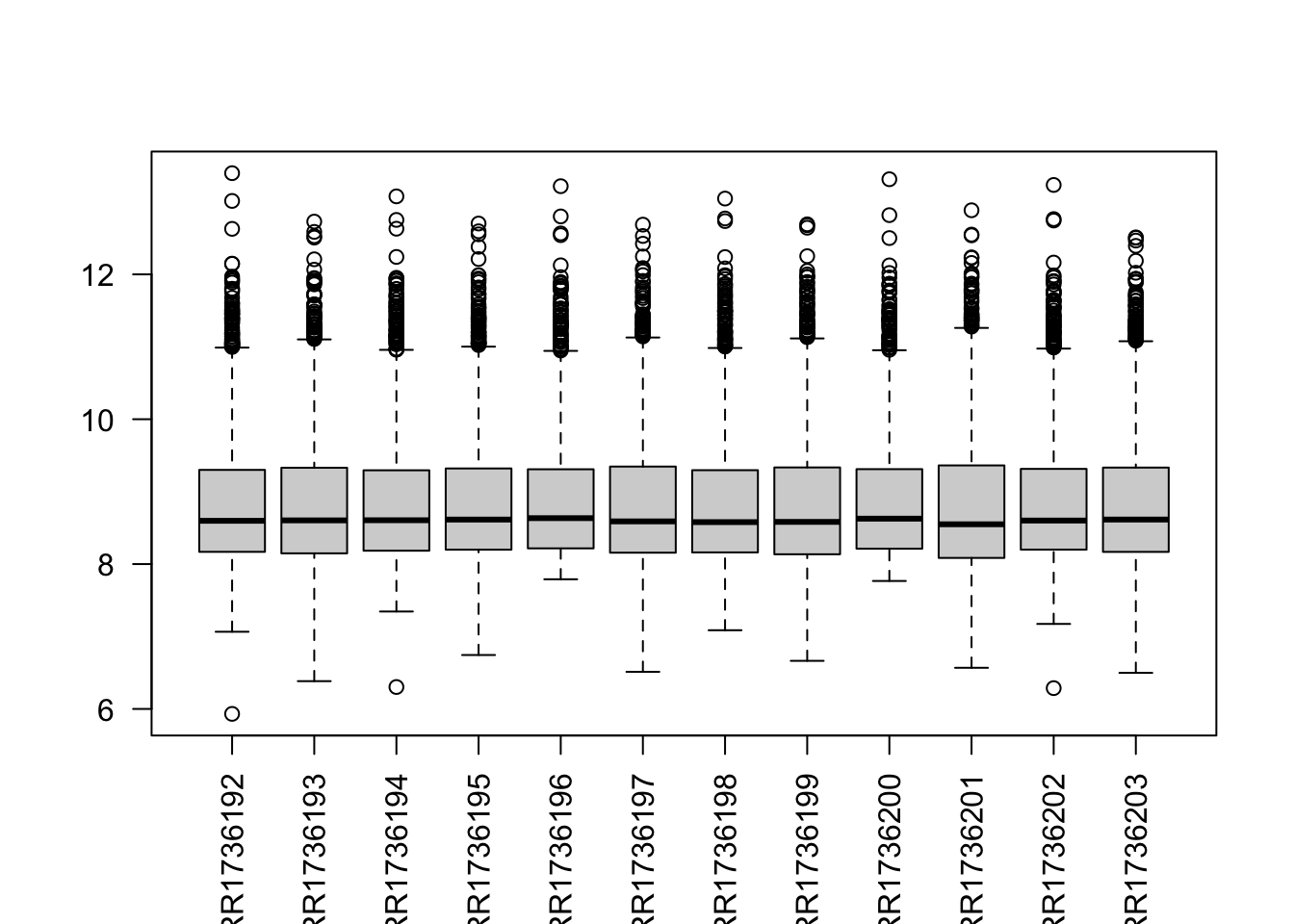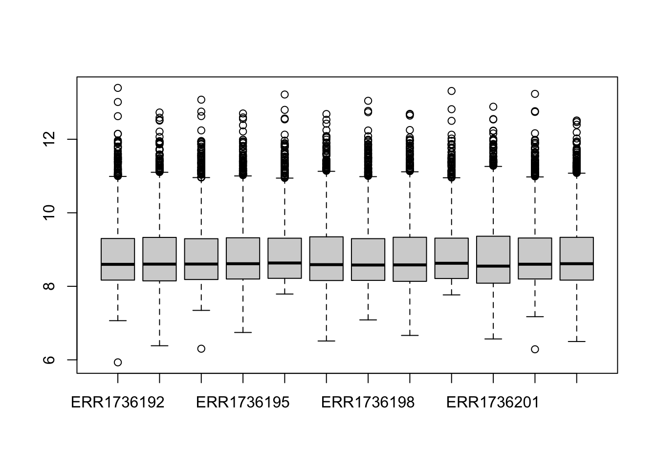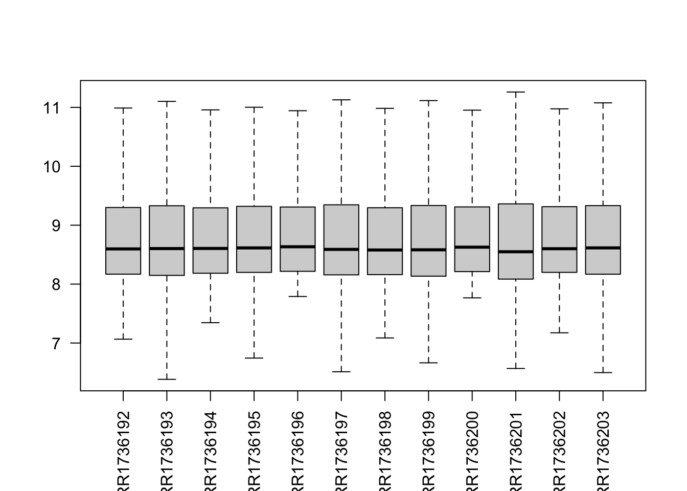 ..$ ERR1736203: num [1:1642] 8.81 10.99 8.34 10 9.61 ...
