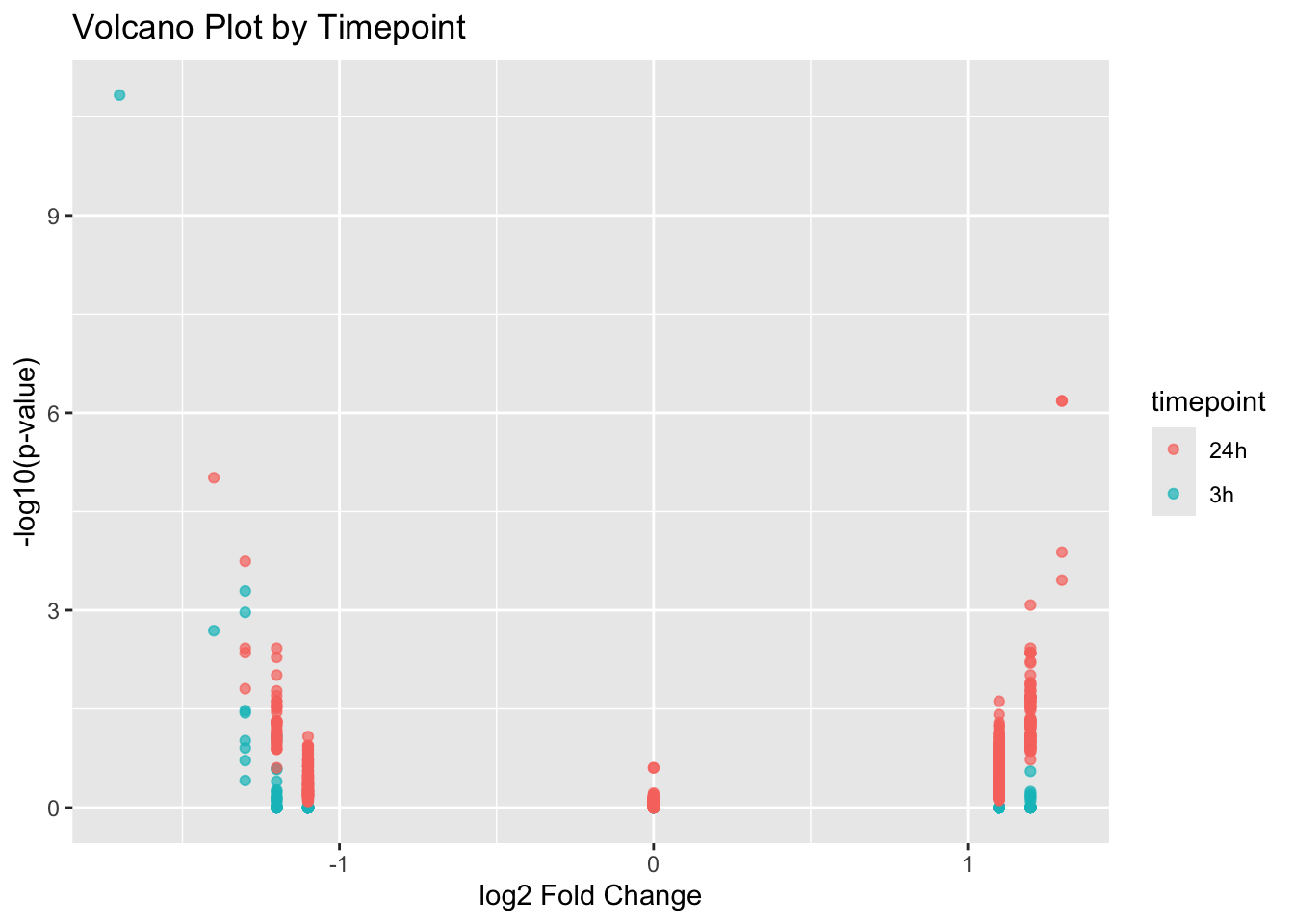 In Block 2, we created two separate volcano plots for the 3h and 24h timepoints. We can use faceting to create a single plot with two panels.