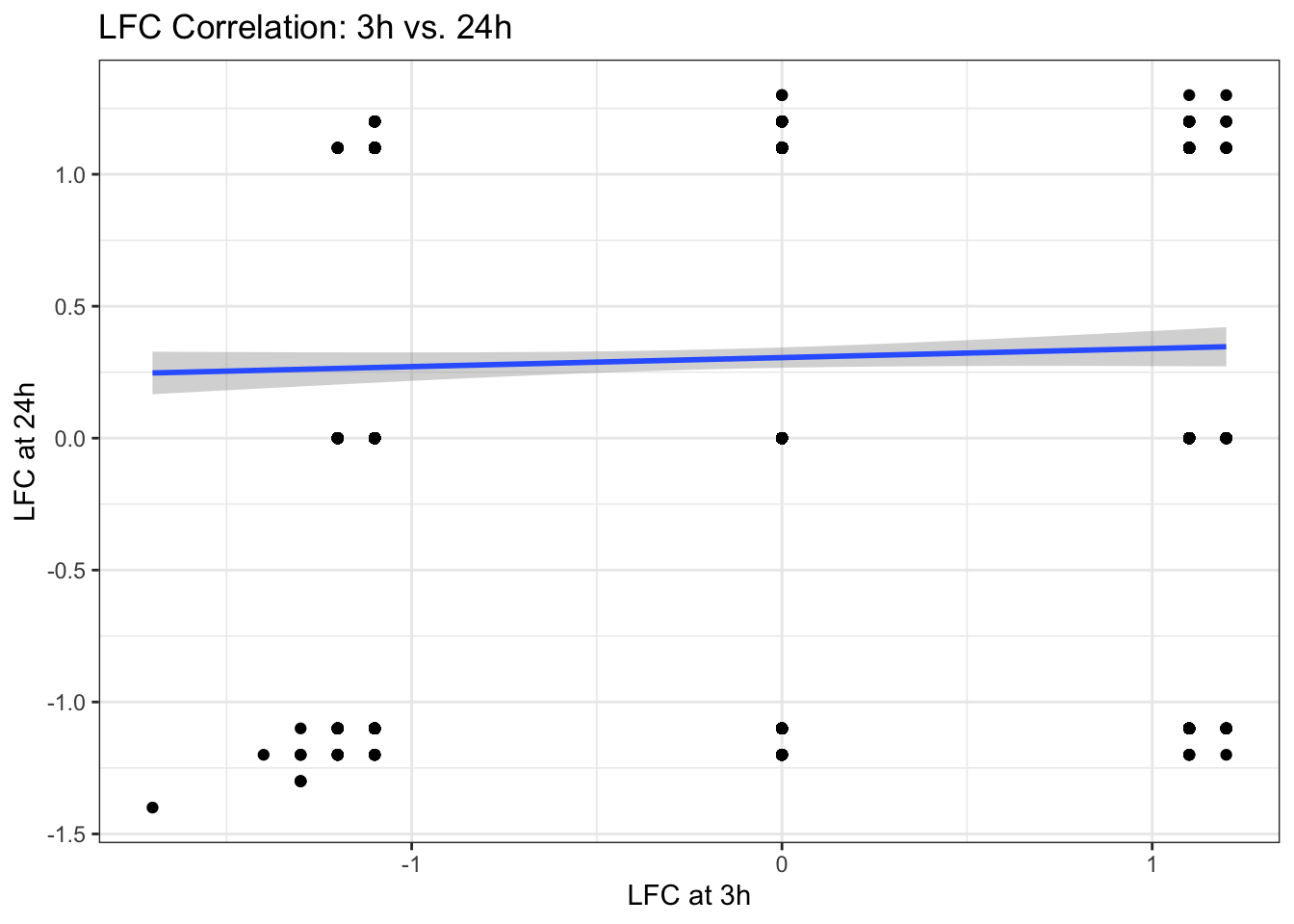 Let’s investigate the relationship between the log-fold change (LFC) at 3h and 24h. Understanding this correlation can reveal how gene expression changes evolve over time. We will use geom_smooth() to visualize this relationship with a linear regression line and its confidence interval, providing insight into the trend and variability.