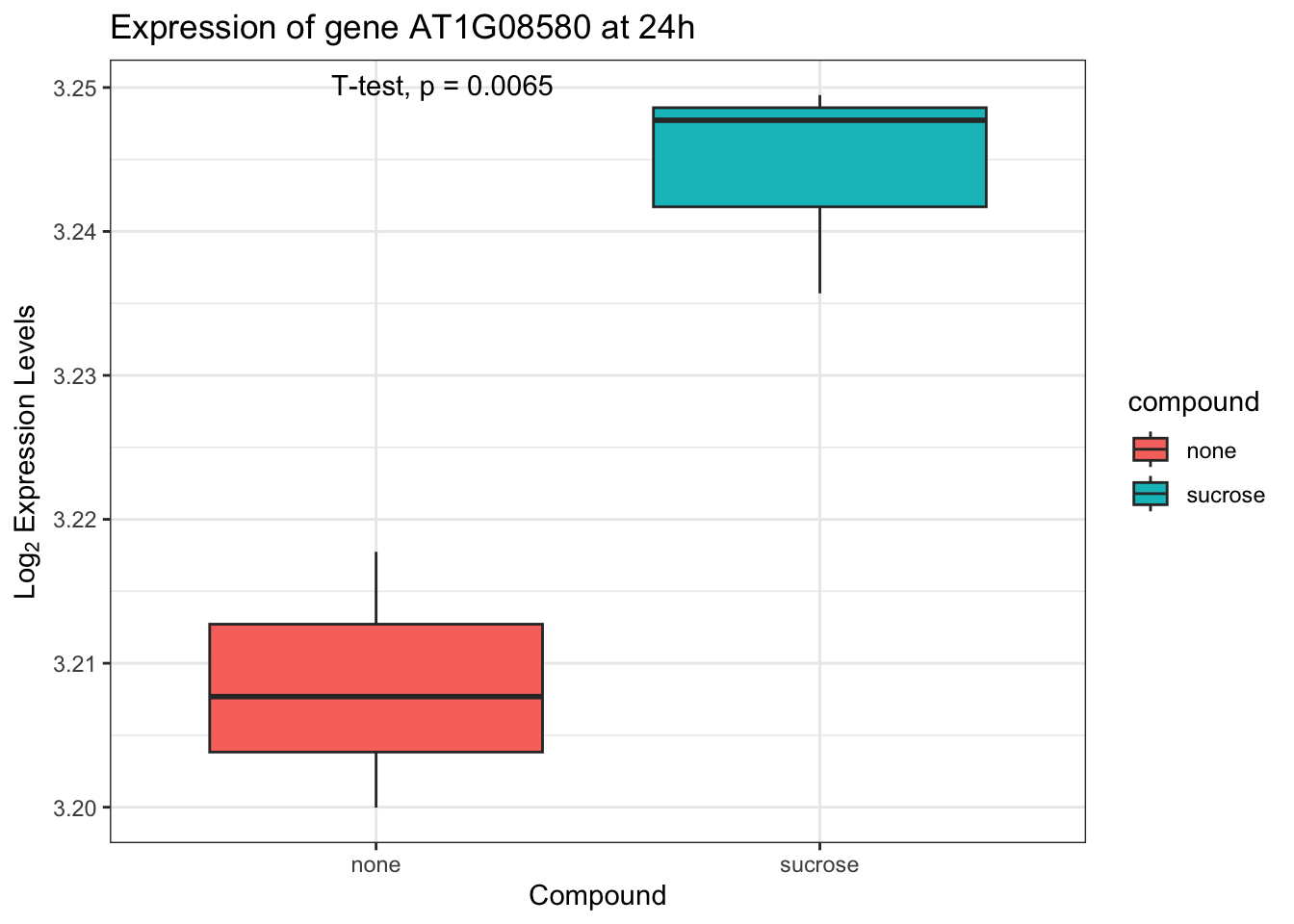 B. Create a boxplot of the log2 transformed expression for the selected gene, comparing “none” and “sucrose” conditions.