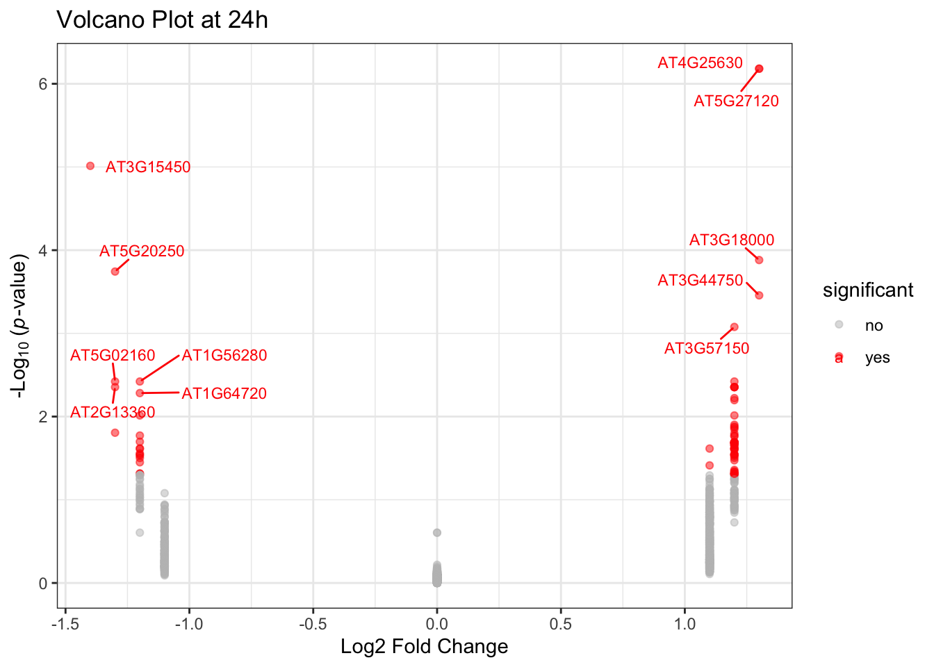 Let’s create a volcano plot to visualize the differential expression results at 24h. A volcano plot is a powerful visualization that combines information about fold-change (on the x-axis) and statistical significance (on the y-axis). By plotting -log10(p-value), we can easily spot the most statistically significant genes, as smaller p-values will correspond to larger values on the y-axis. This allows us to quickly identify genes that are both substantially and statistically differentially expressed. We will also use ggrepel::geom_text_repel() to add labels to significant genes without overlapping, ensuring readability.