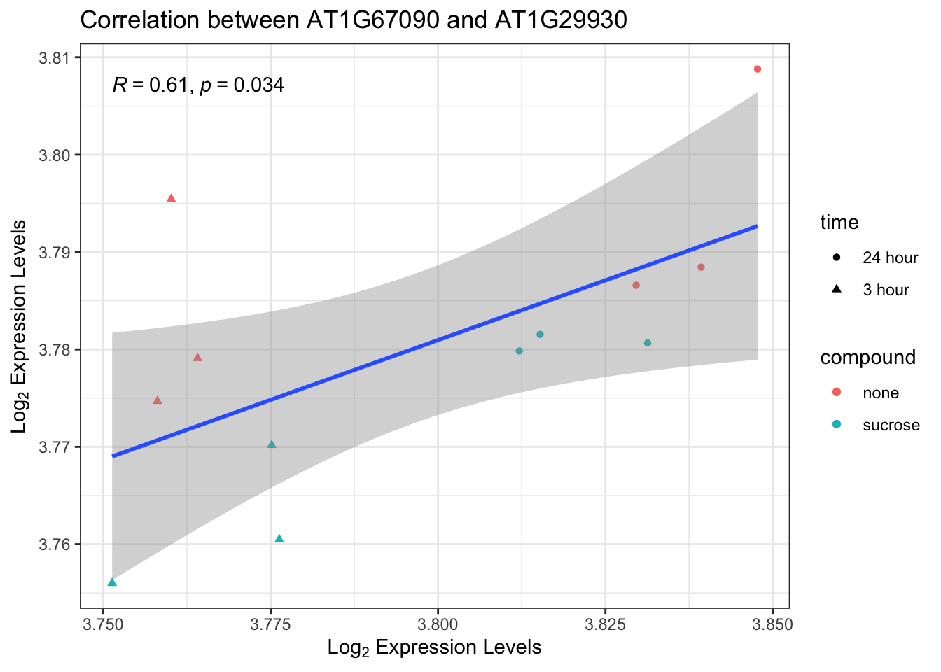 ggplot2plots usinggeom_smooth(). - Incorporate correlation coefficients and p-values into plots using functions from the